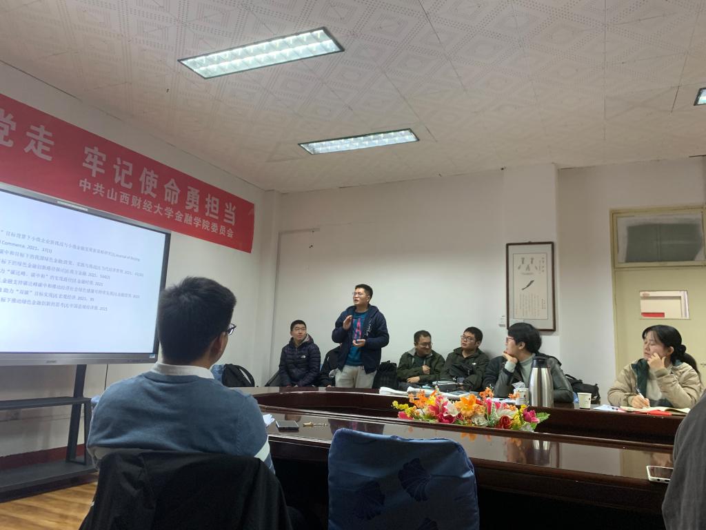 2021-2022学年第4期学术沙龙活动在学院会议室如期举行,本次沙龙的主题是"双碳背景下,绿色金融如何发展", 由2021级金融专硕班的张家豪和胡长庆为大家作汇报讲解,本次沙龙有幸邀请到崔婕老师和李燕平老师作为讲评嘉宾,参加本次沙龙的学生有来自2021级各专业同学。
