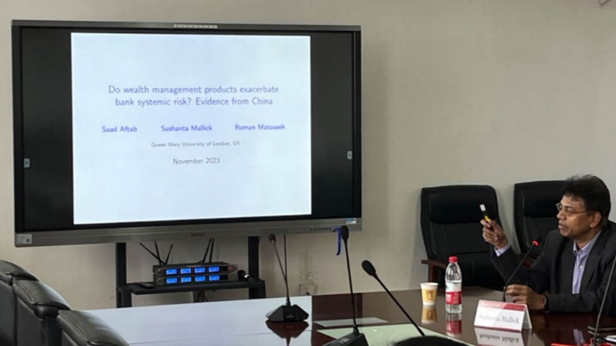 Prof. Sushanta reviewed the research progress on bank wealth management products and systemic risk, discussed the impact of financial products on systemic risk under different sources of funds, and explained its mechanism; According to the data of 37 Chinese listed banks, he established an empirical model of the impact of wealth management products on systemic risk based on calculating the systemic risk using the baseline methodology, and had conclusions which are significant to the reality.