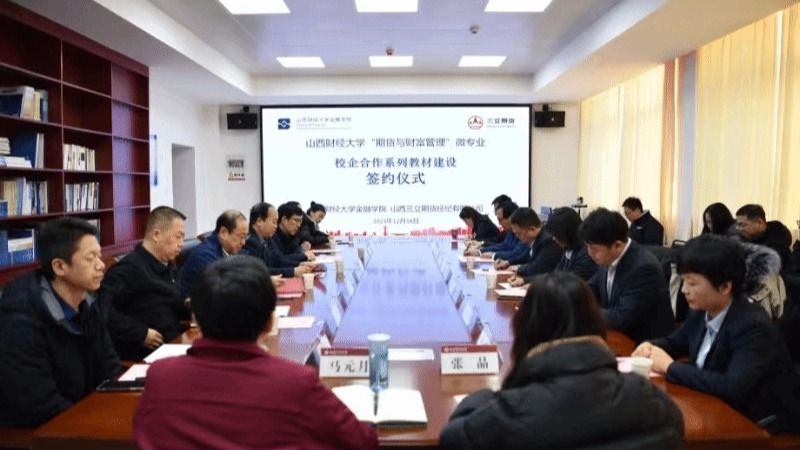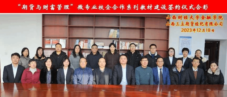2023年12月18日上午,“期货与财富管理”微专业校企合作系列教材建设签约仪式在修德楼705室举行。成人影片 党委常委、副校长沈沛龙、山西三立期货经纪有限公司董事长兼总经理李旭、校教务部部长张文龙、成人影片 党政领导班子及教研室主任、山西三立期货公司高管及相关部门负责人等20余人参加,此次签约仪式旨在加强双方在期货教育领域的合作,共同推动期货人才的培养。