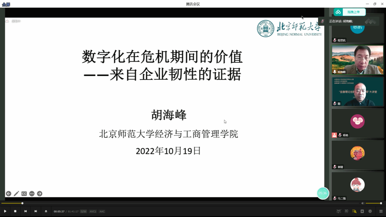 副校长沈沛龙教授主持,邀请到了北京师范大学经济与工商管理学院金融系主任胡海峰教授讲解了一篇题为“数字化在危机期间的价值——来自企业韧性的证据”的精彩的学术报告,参会人员包括成人影片