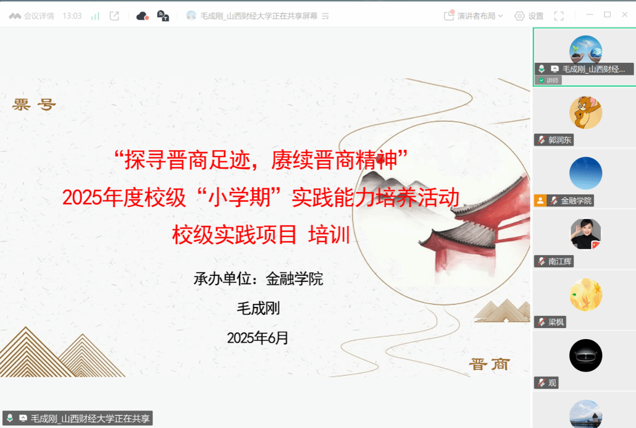 会议第二项,毛成刚老师对 “小学期” 校级实践项目 “探寻晋商足迹,赓续晋商精神” 进行了详细介绍。首先,他阐述了该项目开展的意义,让同学们认识到这一项目对于传承晋商精神、了解晋商文化的重要性;接着介绍了实践地点,使同学们对实践的具体场所有所了解;还分享了研究设想计划,让同学们对项目的研究方向和目标有了清晰的把握。其次,毛成刚介绍了该项目开展所应用的田野调查、实地访谈、文献资料查阅等具体研究方法,这些方法为同学们开展研究提供了有力的指导;同时说明了同学们最终完成该项目所需要完成的成果形式,让同学们明确了自己的任务。最后,毛成刚展示了部分往年调研实践成果,这些成果不仅展现了以往学生的优秀表现,也为同学们提供了参考和借鉴。
