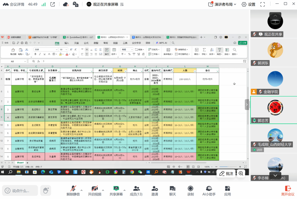 会议第三项,各实践项目带队老师分别介绍了院级实践项目。李志楠老师介绍的 “走进证券” 活动,学院将邀请山西证券专家来校讲座,让同学们学习证券领域的专业知识,同时组织学生参观山西证券投教基地,使同学们能够将理论知识与实践相结合。郭志芳老师介绍的 “走进银行” 活动,学院将请银行专业人士来校分享从业经历,让同学们了解银行行业的实际工作情况,并带学生参观、调研中国农业银行柳南支行,增加同学们的实践经验。李建莹老师介绍的 “走进期货” 活动,学院将邀请三立期货高管来校做专题报告,为同学们讲解期货行业的知识和发展趋势,同时带学生参观三立期货公司,体验交易操作,让同学们更直观地了解期货交易。梁枫老师介绍的 “走进财富” 活动,学院将邀请晋金财富专家来校做专题报告,之后会组织学生到晋金财富公司进行实地调研,让同学们深入了解财富管理领域。张晶老师介绍的 “走进保险” 活动,将邀请太平人寿保险公司高管来校做讲座,之后将带学生参观泛华保险公司,使同学们对保险行业有更全面的认识。张亚兰老师介绍的 “走进红色金融” 活动,学院将邀请马文玉纪念馆馆长来校讲解,之后将带学生参观马文玉纪念馆和故居,让同学们了解红色金融的历史和发展,传承红色金融精神。卞小娇老师介绍的 “走进低空经济” 活动,将分别进行低空经济讲座和实地调研活动,让同学们了解新兴的低空经济领域。